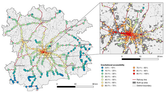 Accessibility of population with rail-based public transport at railway stations in the MMR 2019 (Munich main station = 100%) (Source: own work, using geodata by Bayerische Vermessungsverwaltung, Bundesamt für Kartographie und Geodäsie, Deutsche Bahn).