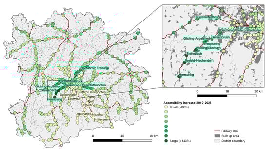 Change of accessibility of population with rail-based public transport at railway stations in the MMR 2019–2028 (Source: own work, using geodata by Bayerische Vermessungsverwaltung, Bundesamt für Kartographie und Geodäsie, Deutsche Bahn).
