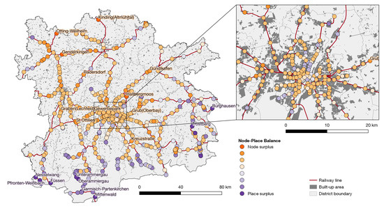 Balance of accessibility (“Node”) and functional density (“Place”) around railway stations in the MMR in 2019 (Source: own work, using geodata by Bayerische Vermessungsverwaltung, Bundesamt für Kartographie und Geodäsie, Deutsche Bahn).