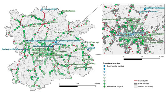 Surplus of residential or commercial (firms and services) uses at railway stations in the MMR 2019 (Source: own work, using geodata by Bayerische Vermessungsverwaltung, Bundesamt für Kartographie und Geodäsie, Deutsche Bahn).