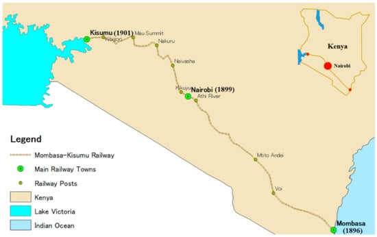 The British claims on Kenya started with William Mackinnon’s Imperial British East Africa Company (IBEA), which was granted a royal charter in 1888 to administer the area between the Indian Ocean and Uganda. This area was proclaimed to be the British East African Protectorate in 1890, and, in 1895, the largely unsuccessful IBEA transferred its charter to the British Government []. In 1896, the construction of the Uganda Railway was commenced in Mombasa by the British Government, and, by May 1899, the railway reached Nairobi, where a temporary camp and railway depot was set up. This later became the headquarters of British East Africa (BEA) [].