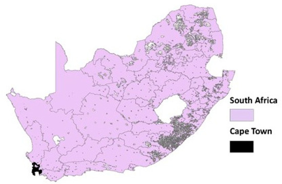 Cape Town occupies 22,240 km2 of the Western Cape and is the second most populous city in South Africa. The number of informal settlements in the city is estimated to have increased from 50 in 1993, to 230 in 2010, and then to 379 settlements in 2014 [32]. This equates to around 20.5% of the city’s population in 2013 [33]. Further, there is a clear demarcation between low, middle and high-income housing due to apartheid and post-apartheid land use policies. While informal settlements have continued to grow, new housing for the low-income communities continues to be located in the peripheries [34] thus precipitating marginalisation of this cohort of individuals. Figure 1 shows the location of Cape Town.