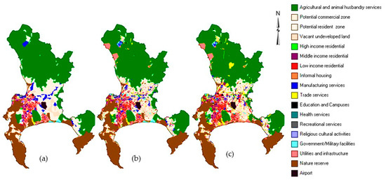 As expected, under the BAU scenario (Figure 8), low-income housing is observed to scatter towards the peripheries while informal settlements were observed to form into large clusters as opposed to “mushrooming” in new locations. However, some new locations of informal settlements were also observed on previously vacant land close to manufacturing services and in some cases close to low-income housing. Additionally, informal settlements are observed to locate adjacent to low-income residential areas and manufacturing services.