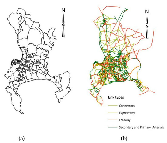 (a) The Traffic Analysis Zone (TAZ) boundaries; (b) the road network and link types used in the Cape Town model.