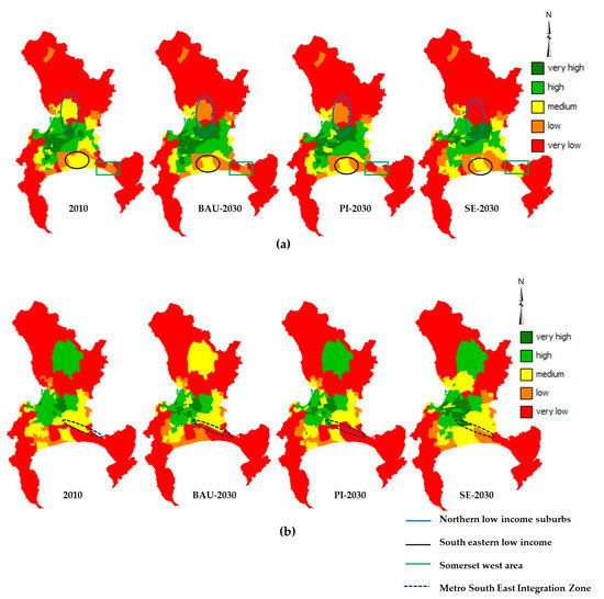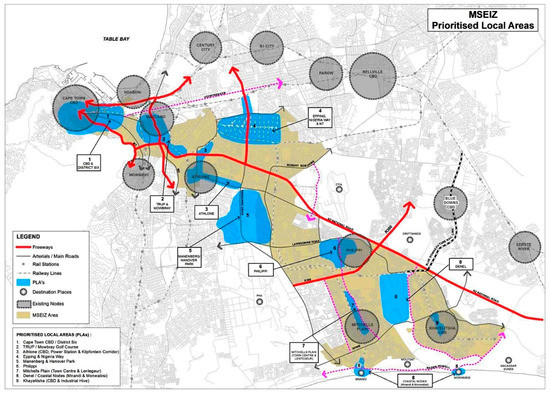 Like Scenario 3, this scenario also tests components of proposed urban development strategies in Cape Town, specifically it focuses on redressing some of the spatial issues in the City by ‘unlocking’ low-income housing in areas with fully developed transport infrastructure with access to economic opportunities. The scenario considers compact growth or densification strategies where the focus is on the extensive development of the Metro South East Integration Zone (MSEIZ) specifically the area with low-income areas, such as Philippi, Mitchells Plain and Khayelitsha. This corridor houses 40% of Cape Town’s population of which most of them are marginalised with low income, have poor access to essential services and are also in need of formal housing [77,78]. Therefore, this scenario allocates all of the 1% low income housing which the city is estimated to deliver yearly [79] on the MSEIZ to test the potential benefits of redressing social exclusion. Figure 4 presents the spatial structure of the MSEIZ.