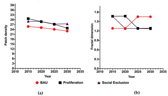 Another observation under the SE (Figure 5) and PI (Figure 7) scenarios was that the growth in low-income residential areas was not necessarily accompanied by urban expansion. This was linked to the redevelopment of old buildings into new low and middle-income residential areas, especially along the southern suburb corridors. Overall, there are noticeable differences on the MSEIZ corridor towards the low-income eastern suburbs where there are high land use densities under the SE (Figure 6) scenario, compared to the BAU (Figure 8) and PI (Figure 7) scenarios. This is expected as the SE scenario focused on stimulating land use development especially low-income housing along well-developed transport corridors. This finding is supported by the low patch density under the SE scenario (Figure 6a) where the focus on land use development was along the MSEIZ corridor which previously was characterised by low land use densities. This is an expected finding as the scenario focused on compact growth especially through infilling hence the patch density consequently decreased.