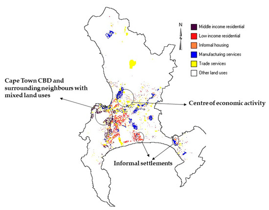 While the research focuses on the dynamics relating to informal settlements and low-income housing; to have a realistic representation of the urban land use dynamics, middle-income, high-income residential housing, manufacturing services and trade services were also modelled as function land uses. These land uses were identified to make up the main work-related origins and destinations in Cape Town and are, thus, essential in understanding social and economic inclusion trends within the city.