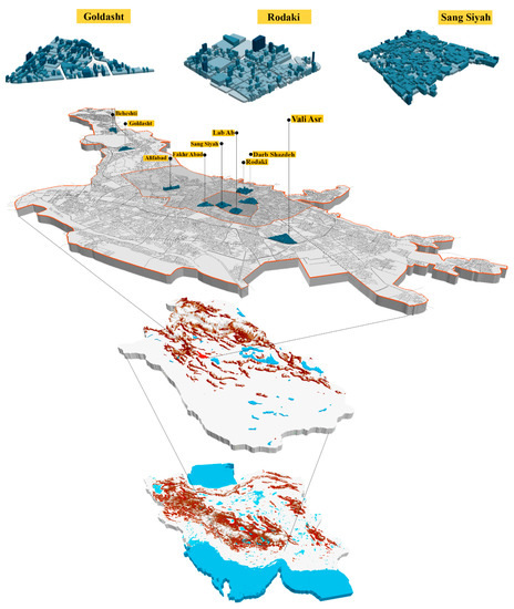 Shiraz, the capital city of Fars Province, is a major Iranian city located in the southern part of the country (29°36′37.1″ north (N), 52°31′52.1″ east (E)). The city has a total area of about 240 km2 and is the fifth most populous city of Iran, with a population of about 1.55 million according to the latest census data (Fars Statistical Annals). Shiraz is bounded by mountains on three sides and, according to the Köppen Climate Classification, features hot and semiarid (BSh) and cold and semiarid (BSk) climates (Fars Metropolitan Planning Organization). It is an old city and was the capital of the country during the Zand Dynasty. Like other old Iranian cities, Shiraz features different urban patterns, making it a suitable case for comparative analysis. Due to its exposure to several climatic and non-climatic risks, increasing resilience in the city is essential. Shiraz is prone to seismic hazards due to its proximity to the Kareh Bas fault [18]. Heat stress is also a major hazard as, during some summer days, the maximum daily temperature reaches about 43 °C. Heat stress is expected to further increase in the future due to climate change impacts. Furthermore, during the past few years, several major flash floods have occurred in the city, causing substantial human and economic losses. As a case in point, during the catastrophic (March) 2019 flood event, 21 people died, and many properties were damaged (the governor of Shiraz announced that the damage caused by the flood was about 8 million USD according to the reports prepared by the metropolitan organizationto). Accordingly, in this study we examine resilience to earthquakes, extreme heat, and flood events.