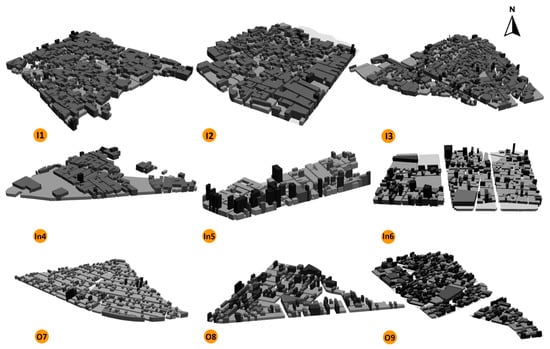 For comparative analysis in this study, we selected nine neighborhoods representing these three urban patterns. To improve generalizability of the results, three neighborhoods were selected from each ring. The selected neighborhoods were, namely, Sang Siyah (I1), Lab Ab (I2), and Darb Shazdeh (I3) (from the inner ring), Fakhr Abad (In4), Afifabad (In5), and Rodaki (In6) (from the intermediate ring), and Vali Asr (O7), Goldasht (O8), and Beheshti (O9) (from the outer ring). Some descriptive statistics related to the selected neighborhoods are presented in Table 1. Furthermore, the layout pattern of each neighborhood is shown in Figure 2.