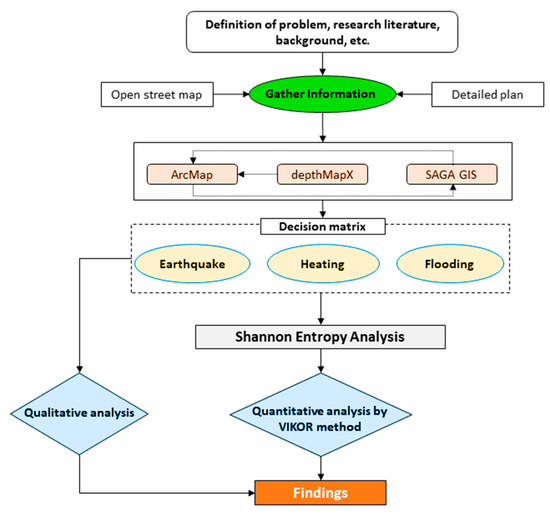 After extracting all the necessary information related to the selected indicators, we used a combination of Shannon entropy and the VIKOR model for multicriteria decision analysis to rank the selected neighborhoods according to their resilience to earthquake, heat events, and flooding.