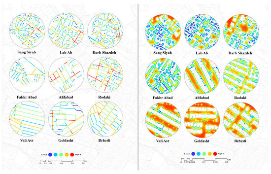 We also considered indicators related to streets and street canyons. As streets are major constituent elements of cities, their role in improving accessibility is particularly important. Higher levels of street connectivity improve redundancy and are, therefore, more desirable for maintaining accessibility during adverse events such as earthquakes [45]. High street connectivity, in combination with pervious surfaces and green infrastructure, can also increase resilience to heat and flooding events [46,47]. Street integration is also another measure of accessibility and, therefore, higher values are more desirable [48]. Centrality indicates the relative importance of nodes/links in a street network. In case a node/link with high centrality values is obstructed, it may cause significant disruptions in terms of accessibility to damaged areas. Such a situation may occur when centrality values are not homogeneously distributed. As a result, a highly central node/link may be surrounded by nodes/links with lower centrality values. This erodes response capacities during adverse events such as earthquakes and floods due to the strong reliability on the highly central node/link. Additionally, there is evidence showing that higher levels of centrality are associated with a more intense urban heat island effect [47]. Street depth is a measure of complexity of the network and indicates the ease of reaching from one point to another [48]. Higher values of street depth indicate less accessibility and are not desirable. Street width has also implications for resilience. Wider streets are generally deemed more desirable as they can facilitate better accessibility and also allow integrating elements such as green infrastructure that can contribute to stormwater management and heat island mitigation. Addressing the latter, however, is also dependent on the height of buildings that flank street edges. In other words, the height/width ratio has implications for thermal comfort in the street canyon, as it can affect patterns of solar irradiation and wind circulation. Therefore, depth of the street canyon should also be considered as it may affect accessibility, as well as the microclimatic conditions related to heat stress (in other words, the height/width ratio). Destructions of high-rise buildings adjacent to deep street canyons make response and recovery efforts more challenging. Therefore, such canyons are not desirable in terms of earthquake resilience [45]. However, for climatic conditions of Shiraz, deeper canyons can provide shading benefits and, thus, mitigate heat stress.