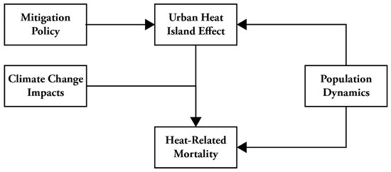 As has been shown by the foregoing discussion, the UHIMPT model includes various components to account for the urban heat island effect (incl., the impact of hypothetical urban heat island mitigation policy), the impacts of climate change, population dynamics, and heat-related mortality. The generalized relationships between these components are demonstrated in Figure 1.