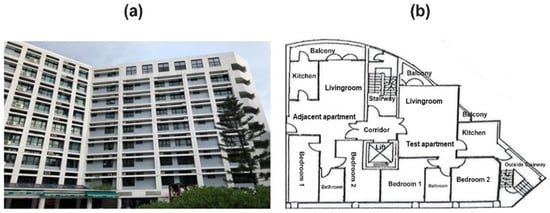 The experimental measurements used to validate the CONTAM simulations were conducted in an eight-story residential building (Figure 1). This building is located on the campus of City University of Hong Kong (CityU) in Tat Chee Avenue, Kowloon, Hong Kong. One apartment on the fifth floor, height ~15.6 m above the ground, was selected as the test apartment and adjacent units that are directly (test apartments on upper and lower floors) or indirectly (opposite adjacent apartment) connected with the test unit horizontally and vertically, as shown in Figure 1b. The test apartment consisted of two bedrooms, kitchen, bathroom and living areas, with a total floor area of 77.6 m2 and a volume of 201.8 m3. The external walls were made from concrete, with exterior ceramic sidings and an internal finish of vinyl covered drywall. The doors of the corridor connecting the stairway were normally closed as the door is used as an emergency exit. The lift door was also closed during the test to reduce the stack effect in the building. The balcony areas were regarded to be the outside for the purpose of these experiments. This apartment has three 1.1 kW air conditioners, located in the living room and two bedrooms. There are two exhaust fans located in the kitchen and bathroom. The leakage areas for the whole apartment were determined using blower-door pressurization tests with a measurement uncertainty of around 5% []. These values were used in the CONTAM model. Although different residential buildings have different floor layouts, the layout of this test building represents a basic form for residential apartments in Hong Kong, including two apartments connected with one common area (corridor, lift, and stairway) on the same floor. It provides a good example for showing the changes of indoor PM2.5 concentration in multistory buildings.