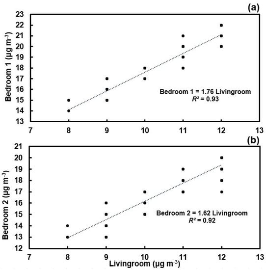 Calibration between fine particulate matter (PM2.5) monitor in living room and bedroom 1 (a) and in living room and bedroom 2 (b).