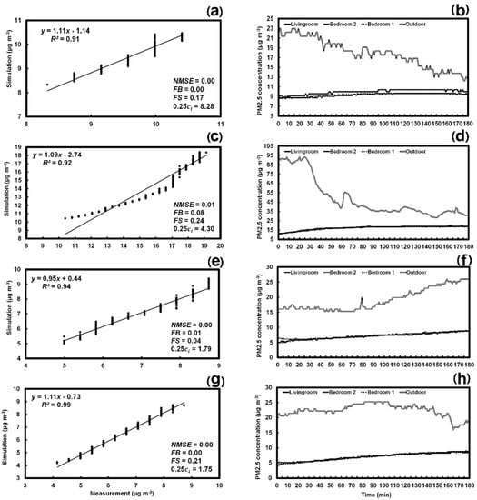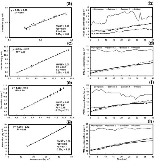 PM2.5 concentration of CONTAM simulation and measurement in the living room and the measured PM2.5 concentration in four places (living room, bedroom 1, bedroom 2, and outside) under three-hour natural conditions on four different days: 11 September (a,b), 12 September (c,d), 13 September (e,f), and 15 September (g,h), respectively. The y is the simulation, and x is the measurement.