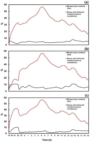 Table 2 shows estimated deposition rates and penetration factors for the test periods. These estimates were based on the Equation (3) that only considers the outdoor concentration without people in neighboring units. The average deposition rate for PM2.5 was computed to be 0.13 h−1 and 0.12 h−1 under natural pressure differences for the blower-door method and CO2 decay-rebound method, respectively. Although the estimated deposition rate is lower than experimental results often reported in the literature [,,], a similar result was found by Long et al. []; that there was better agreement between their data and the theoretical predictions. The average penetration factor was calculated to be 0.89 based on the 4 Pa depressurization set, while 0.84 for CO2 decay-rebound method. The blower-door method gives higher precision for the estimates with lower coefficient of variation as shown in Table 2, which shows a good agreement with a previous study [].