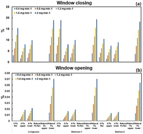 Window opening is one of the most important controls on indoor pollutant levels [], but there are few investigations of the effect of windows in adjacent apartments. Figure 7 illustrates the increased percentages of the PM2.5 accumulating in the three indoor zones at five emission rates in the three adjacent apartments: (a) when all windows were closed or (b) open in opposite neighboring apartments on the same day. Higher generation rates always result in increased percentages of indoor PM2.5 level for the whole apartment. The increased percentages found when windows are closed are much higher than those for all zones, when windows are open. The highest value is up to 20% for closed windows, but only 0.07% for open windows. It suggests that the indoor PM2.5 concentration is less influenced by the PM2.5 generation of neighboring apartments when all windows are open, probably because open windows result in larger air change rates and mean that the increased particle concentration in neighboring apartments disperse outdoors. The resulting PM2.5 concentrations tend to be similar even when generation rates change.