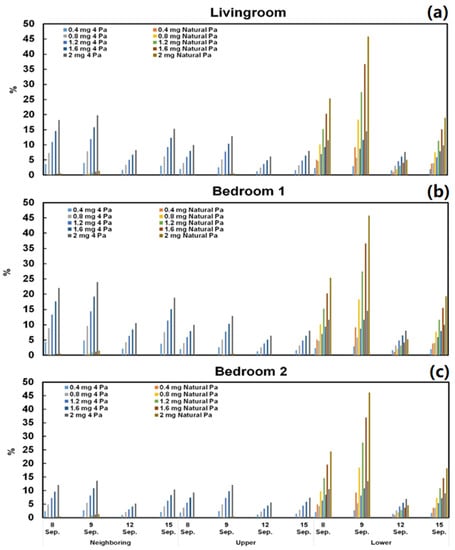 The percentage increase of PM2.5 concentration in living room (a), bedroom 1 (b) and bedroom 2 (c) in four days (8, 9, 12, and 15 September) with five generation rates (0.4; 0.8; 1.2; 1.6; 2 mg min−1) on the three floors (neighboring, upper, and lower apartments) based on two conditions.