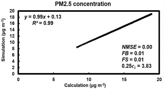 An example of the relationship between PM2.5 concentrations estimated from Equation 9 and the simulated concentrations at 4 Pa depressurization.