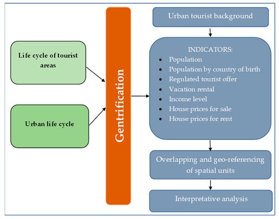 Therefore, the use of these four main sources allows us to characterize the evolution of the population and residents according to their origin, the income of the resident population, the supply of tourist accommodation, and the evolution of the sale and rental prices of housing. These are the seven indicators that have been used to analyze the residential and tourist dynamics of both neighborhoods and to detect whether there are processes of gentrification that are leading to the displacement of population according to country of birth (see Figure 1).