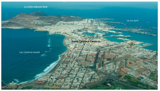This neighborhood is located at the northern end of the isthmus of Guanarteme and sits on the tongue of sand that covers the lava flows from the Holocene volcanic cones of the peninsula of La Isleta, which connect it to the rest of the island of Gran Canaria (Figure 2).