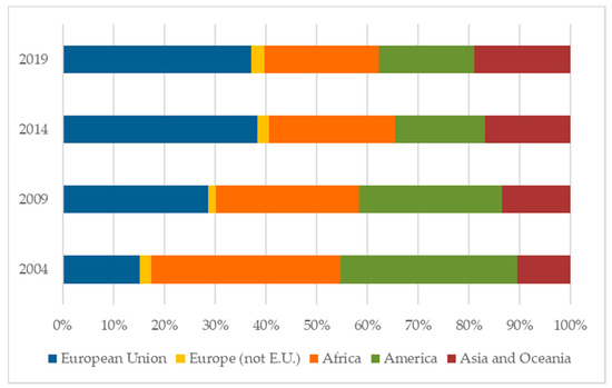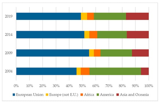 This trend is supported by the analysis of the evolution of the foreign population according to origin (Figure 5). As in the case of the Canary Islands, the representation of foreigners from the European Union is increasing (almost 50% of the total in 2019) and, to a lesser extent, that of Asians (mainly Chinese and Filipinos). This relative growth occurs mainly at the cost of a loss of representation of Americans. The latter have gone from almost 40% in 2004 to less than 25% in 2019.