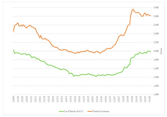 Average price per m2 in Euros of sales (2009–2019) in Las Palmas de Gran Canaria and Santa Catalina-Canteras. Source: Own elaboration from El Idealista.