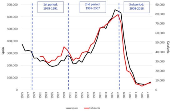 Property dynamics in Spain and Catalonia and urban planning periods. Housing units built in Spain (left axis) and Catalonia (right axis) (data from https://www.mitma.gob.es/vivienda (accessed on 23 March 2019) and http://habitatge.gencat.cat/ca/dades/estadistiques_publicacions/ (accessed on 20 March 2019).