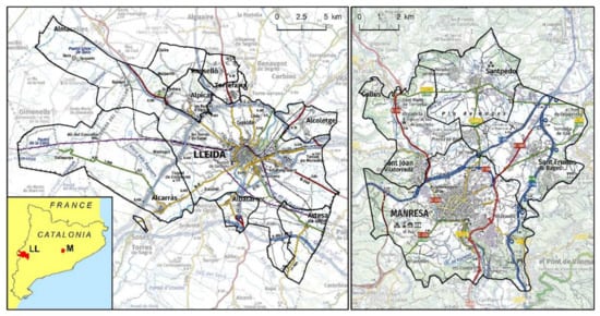 Urban areas and municipalities of Lleida and Manresa. Own elaboration based on Institut Cartogràfic i Geològic de Catalunya [36].