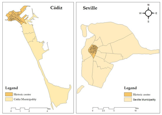 Historic centers of Seville and Cádiz. Source: Prepared by the authors with data from the IECA [21].