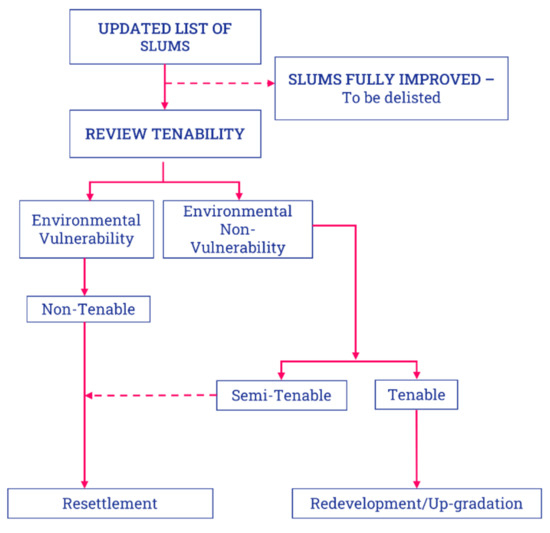 Pune is the second-largest city in the state of Maharashtra, 150 km from the state capital, Mumbai, and the eighth largest Urban Agglomeration (UA) of India with a population of approx. 5 million people [21,22]. The paper focuses on Pune City (Figure 1), which is part of the UA and has a population of approx. 3.1 million [23]. Estimates on the number of slum dwellers vary: while Pune Municipal Corporation (PMC) [24] assumes 1.2 million slum dwellers (38.7%) for the year 2009, the national census estimates the slum population at 0.69 million for the same year [4]. Despite these differences in slum population estimates, it is irrefutable that a large share of Pune residents live informally. The “Revised City Development Plan (CDP) of Pune City-2041” [25] depicts the vision of a “Slum Free City with Inclusive and affordable Housing for all” [25] (p. 89). This is to be reached by applying two major schemes: “Basic Services for Urban Poor (BSUP)” which is a submission of “Jawaharlal Nehru Urban Renewal Mission (JNURM)”, and “Rajiv Awas Yojana (RAY)”. RAY suggests state governments a two-step approach for improving the living conditions in existing slums and preventing the growth of further informal settlements. The first step is a curative strategy suggesting up-gradation, redevelopment, or resettlement, while the second is a preventive strategy, which includes developing sufficient accessible affordable housing through cross-subsidies and incentives [25] (p. 90). The curative strategy uses the “Tenability Analysis” shown in Figure 2. The land on which the slum pockets are located are assessed to determine whether they should be (a) rehabilitated through resettlement in a new area, (b) upgraded in-situ via retrofitting, or (c) redeveloped, i.e., upgraded through shifting to a multi-storey housing within the same land parcel. For this research paper, we consider these three approaches and the corresponding neighbourhood to study how the residents perceive liveability, and which liveability indicators they consider most relevant. As a reference, a fourth neighbourhood of slums which has received no major upgrading is also considered. The selected neighbourhoods are discussed further in the Section 3. The next sub-section discusses the process of contextualizing liveability indicators, to be adopted in the consecutive steps for liveability analysis.
