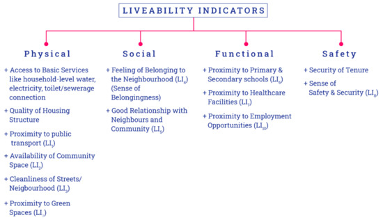 The study adopts 13 indicators (Figure 3) for analysing slums and slum upgrading schemes, based on the current literature on liveability indicators which considers a neighbourhood scale, through the analysis of residential preference, from an LMIC perspective [28,31,32,33]. The indicators have been classified under four thematic dimensions: Physical, Social, Functional, and Safety. Given the complexity and subjectivity of the concept of liveability, this list of indicators does not attempt to be comprehensive, however, the thematic grouping aims to address the potentially relevant aspects in the context of informal settlements.