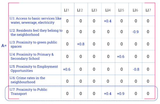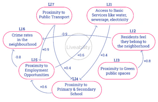 The study understands liveability as inherently a social phenomenon, an outcome of how humans experience their environment and the degree to which this environment facilitates their daily activities, their social mobility, and interaction with one another. As such, it is suitable to use fuzzy logic to analyse liveability which uses human-like reasoning for a better representation of reality. Fuzzy Cognitive Maps combine fuzzy logic and cognitive mapping to develop a network of cause and effect relations between different variables (liveability indicators) the values of which are “verbally described and do not have to be dimensionally defined” [43]. The cause-and-effect relations show the positive or negative influence of the concepts on each other with verbally assigned weights [43] such as “very little”, “a bit”, or “a lot”. These verbally described causal relations are mapped to a fuzzified value between 0 and 1, transforming qualitative values to quantitative values. The model is appropriate for representing unstructured knowledge since it is not limited by exact values and measurements of the variables [44]. The possibility of aggregating individual maps prepared by different interviewees adds to the utility of FCMs [45,46] in facilitating community engagement and participatory decision-making processes.