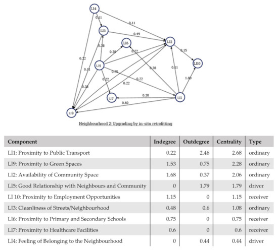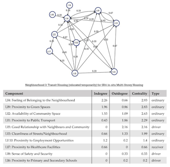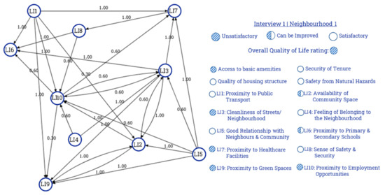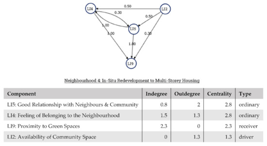 Figure 7 shows an FCM drawn from one of the interviews from Neighbourhood 1. According to Interviewee 1, Cleanliness of Neighbourhood (LI3), would have a strong positive influence on Availability of Community Space (LI2), Proximity to Primary and Secondary Schools (LI6), and Proximity to Green Spaces (LI9). While an increase in Feeling of Belonging (LI4) can positively influence LI3 and lead to a cleaner neighbourhood. In this FCM, LI3: Cleanliness of Neighbourhood has the highest Degree Centrality, which means LI3 has a high contribution to the overall liveability and the concepts LI2, LI6, and LI9 which are directly connected to LI3 can be deduced as priority action points based on the respondent’s perception.