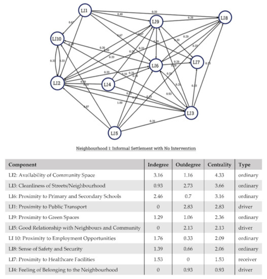 In Neighbourhood 2, the high centrality of Proximity to Public Transport (LI1) may be surprising at first glance, as many bus stops are in close vicinity. In fact, two of the three interviewed residents were satisfied with this indicator. However, the access to transportation was seen as critical for the access to public green spaces (LI9), which they were missing in their community, as well as employment opportunities (LI10). Not only does the spatial “nearness” to the next bus stops play a role here, as interviewees from other neighbourhoods confirmed, but also it is about the ease of traversing the distance, shaped by factors such as the bus schedule frequency and routes or the dirtiness of the path to the bus stop. The high prioritization of good access options by the residents points to a major concern in the case of in-situ upgradation of without enough measures to integrate the upgraded settlement into the network of infrastructures and services enjoyed by the other planned housing developments. Upgrading must represent a shift in the attitude of the local government, recognizing the rights of the inhabitants of the upgraded settlements.