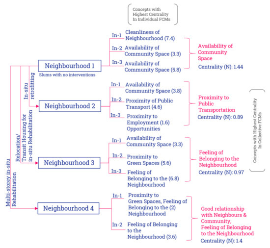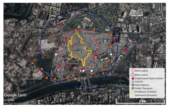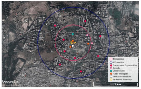 A total of 11 telephonic interviews were conducted: three each from Neighbourhood 1, 2, and 3, and two from Neighbourhood 4. On average, the interviews lasted for 25 min. In addition to analysing the interviews using FCM, basic spatial analysis using Google Earth Satellite Images was done to identify the distribution of schools, employment opportunities, healthcare facilities and parks within a radius of 400 m and 800 m. The radius was based on the “walkable catchments” concept [40] where an area of 400 m radius is within 5 min walking distance and 800 m within 10 min. For more in-depth information on Pune’s individual slums and their morphology, as well as socio-economic status, see the extensive mapping by NGOs Maharashtra Social Housing and Action League (MASHAL) [41] and Shelter Associates [42].