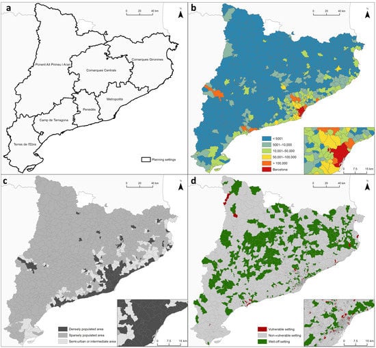 Territorial settings, Catalonia. (a) Planning settings; (b) Population size; (c) Urban/rural character; (d) Residential segregation. Source: In-house construction based on cartography from Institut Cartogràfic i Geològic de Catalunya, inhabitants data from (IDESCAT), Urban/rural character from [,] and Residential segregation from [].