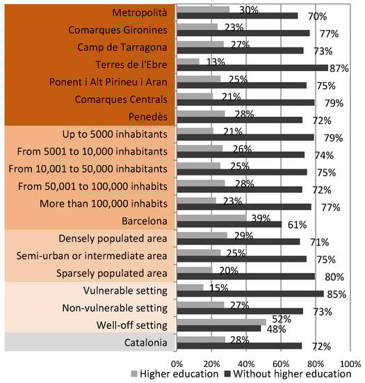 Figure 2 shows the data related to the level of higher education attained by the Catalan population aged 25 and over, grouped in accordance with the four territorial categories used herein (geographical setting, population size, intensity of urbanization and vulnerability). As we can see, the mean of the Catalan population with higher education is 28%. It is immediately apparent, however, that there are significant differences between the various territorial areas, and a comparison between the main geographical settings reveals that the percentage of the population with higher education is greater in the more urbanized areas: the Metropolitan Region of Barcelona, in first place, closely followed by Penedès and the Camp de Tarragona. In contrast, Comarques Centrals and Terres de l’Ebre present much lower values—in fact, the percentage of the population with higher education resident in the Metropolitan Region of Barcelona is twice that of Terres de l’Ebre. It must be taken into account, however, that educational itineraries depend not only on family income and the educational facilities on offer in each territory but also on other factors, such as the economic dynamism, the relative weight of the economic sectors and the qualification requirements of the labour market, as well as sociocultural factors derived from the characteristics of places of residence []. The fact that the area of Ponent and Alt Pirineu-Aran has double the percentage of population with higher education than Terres de l’Ebre, even though both are far from the metropolitan area of Barcelona, confirms the difficulty inherent in any automatic co-opting of geographical proximity to major urban centres as the primary explanatory factor in this field.