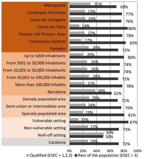 As explained above, the structure of Catalan society has undergone decisive transformations in recent decades [,]. An examination of the distribution of social groups in the Catalan setting reveals data that complement the findings above, although the data used here to observe this distribution are inevitably more limited in scope. As explained in the Methodology section, we used the European Socio-Economic Classification, constructed on the basis of occupational categories, to differentiate between two groups: the population with jobs requiring qualifications (ESEC = 1, 2 and 3) and the rest of the population (ESEC > 3).