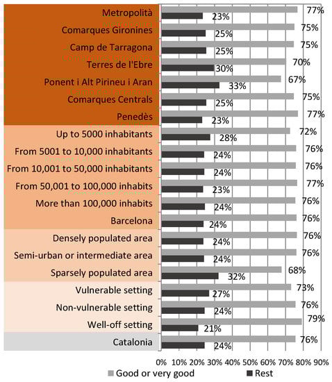 In this case, the data in Figure 5 show biases that can be partly attributed not so much to spatial factors but more to the age structure of the population resident in each area. Thus, territories that have, on average, a more elderly population than that of Catalonia as a whole—as in the case of Ponent and Alt Pirineu-Aran and Terres de l’Ebre, as well as towns with under 5000 inhabitants and sparsely populated areas—present a poorer state of self-perceived health than the rest. Beyond these extremes, however, the differences between settings—whether classified by geographical area, population size or intensity of urbanization—are not very significant. Neither are the differences between the vulnerable and the well-off settings particularly marked, although the latter, as expected, present a notably better state of self-perceived health.