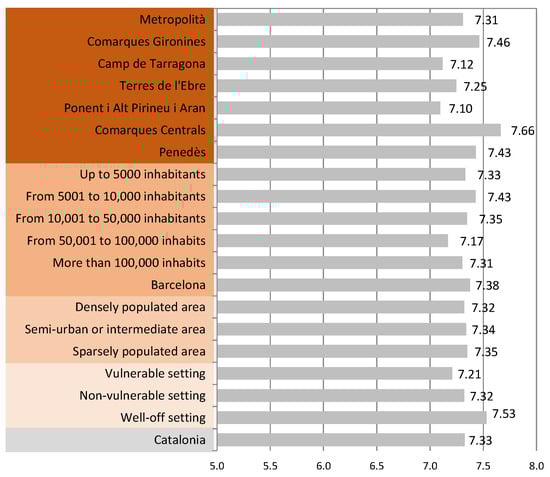 The mean life satisfaction of the Catalan population is fairly high, at around 7.33 (see Figure 6). In this case, the differences with respect to the urban/rural divide are almost irrelevant, as they barely stray from the mean. In contrast, the differences in the classification by population size are more significant, although, even here, there is no clear pattern that makes it possible to relate the two variables. Similarly, although the differences between large geographical settings are relatively more substantial, no logical order can be deduced from them. Once again, the difference that is surely most significant and explanatory is that between the life satisfaction of residents of well-off settings and those of vulnerable settings. In fact, if we leave aside the contrasts between some of the geographical settings, this difference is the most marked of all, and the one that affects most people.