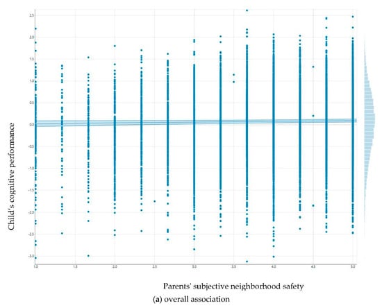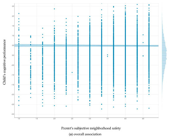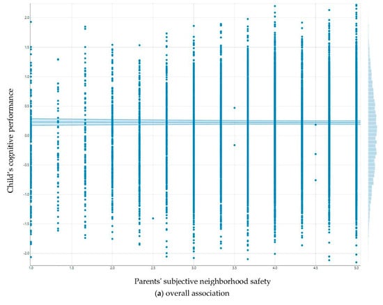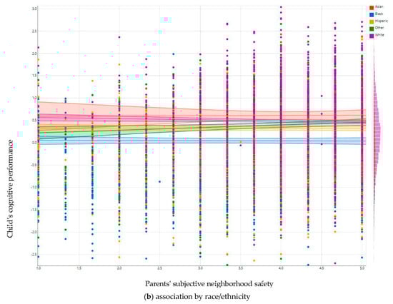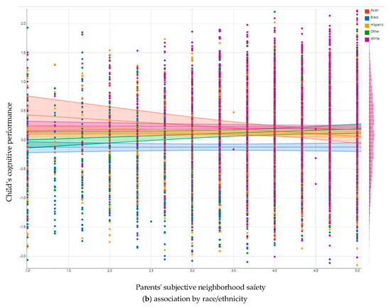 Although various environmental factors influence children’s cognitive development, most previous research has focused on subjective and objective aspects of SES at the family level [42]. There are neighborhood characteristics, such as neighborhood safety, however, that also contribute to racial/ethnic inequalities in child development [16,17,18,19]. Some studies suggest that racial groups may be differently impacted by neighborhood safety [43]. For example, neighborhood safety may better predict Whites’ than Blacks’ life expectancy over a 25-year follow up [43].