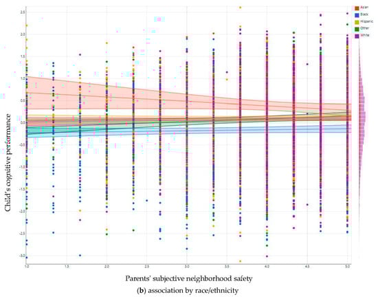 Measures of family SES such as parental education, household income, and family wealth have been consistently associated with children’s developmental outcomes such as cognitive performance [44]. The magnitude of these effects, however, differ across racial and ethnic groups [45]. Nevertheless, family SES reflects a partial aspect of children’s lives. To have a comprehensive understanding of children’s exposure to adversities, more research is needed on how contextual factors such as neighborhood safety influence different racial and ethnic groups. Subjective measures of neighborhood safety are a proxy of how much environmental stress families and children perceive on a daily basis. Chronic exposure to adversity such as living in unsafe neighborhoods may blunt child cognitive development. Thus, while objective measures are essential for understanding the family environment [46,47,48], subjective neighborhood measures are also essential to understanding child development [43].