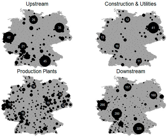 This study focused on which functions public funds attract by using information about the economic activities pursued by MNCs. These functions can be linked to the quality of the investment made and to the various motivations MNCs have to invest abroad. Building on earlier research by Defever [37] and Spies et al. [38], we grouped the economic functions into four different categories: upstream activities (i.e., management and R&D), construction and utilities, and production plants and downstream activities (i.e., business services, sales and marketing, support functions, and logistics). A more detailed overview of the functions included each category can be found in Appendix A (Table A1). Figure 2 displays the spatial distribution of the investments in each function across Germany. Not surprisingly, upstream activities and services operations tend to be concentrated in the large West German cities, whereas downstream functions tend to be concentrated in the Ruhr-area, Rhein-Main area, and Southern Germany. Production facilities and construction are more evenly distributed throughout the country and, in contrast with the other functions, are frequently located in East Germany (see also Spies et al. [38]).