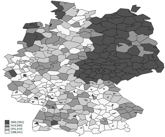 where the ij subscripts on the parameters indicate that a separate set of parameters exists for each district. At the same time, spatial weighting smooths the spatial variation in parameters, revealing only broad regional differences in the local marginal effects. The result is a set of parameter estimates for each district. In our case, this would mean the estimation of 412 different regression models, producing more than 5000 parameter estimates. A more detailed discussion about geographically weighted regression and its usefulness for assessing differences in regional policy effects can be found in Ali et al. [43] and Partridge et al. [44].