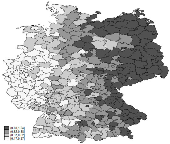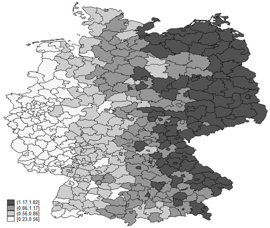 Turning to spatial heterogeneity in the effect of regional public funds on the number of investments, spatial variation in the public funds coefficient is only significant for production facilities, as determined by the Monte Carlo test [47]. The spatial heterogeneity in the effect of regional policies on attracting production plants is indicated by the geographically weighted regressions presented in Figure 5 and Table 7. The estimated coefficients in our geographically weighted regression model range from a minimum of 0.23 to a maximum of 1.82, where again the strongest effect of regional policies on the location choice of MNCs is found in East Germany. These results hold when re-estimating the model using negative binomial estimation and introducing an East German dummy*Public Funds (ln) interaction term.