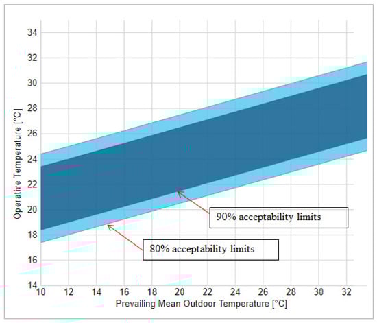 Fanger’s static model (PMV-PPD model) [8] of thermal comfort was a pioneering intervention in human comfort research, defining comfort limits particularly in tightly controlled chambers/air-conditioned buildings. The predicted mean vote (PMV) model consists of a seven-point thermal sensation scale ranging from (+3) hot to (−3) cold [12] and it is best suited to air-conditioned buildings in which the occupants have no control over their immediate surroundings [13]. However, the works by Dear and Brager [14], Nicol [15], Nicol and Humphreys [16], and Fanger and Toftum [17] suggested the importance of adaptive thermal comfort model over the PMV model, as the latter fails to predicts exactly actual thermal sensation in naturally ventilated buildings. The thermal comfort conditions of people living in naturally ventilated buildings depend not only on physiological aspects but also on adaptive nature. Because of this, Fanger’s theory fails in predicting thermal comfort conditions in naturally ventilated buildings [14,16]. In the adaptive thermal comfort model the comfort zone is around the neutrality/comfort line and represents the comfortable upper and lower temperature parameters. Acceptability levels of 90% and 80% limit the comfort zone, with the ideal comfort temperature falling between 2–3 °C on either side of the comfort line, which is considered an acceptable limit [18]. The temperature range identified corresponds to 90% and 80% acceptability limits and could reach approximately 30 °C according to the ASHRAE 55-2017 standard [5] (Figure 1).