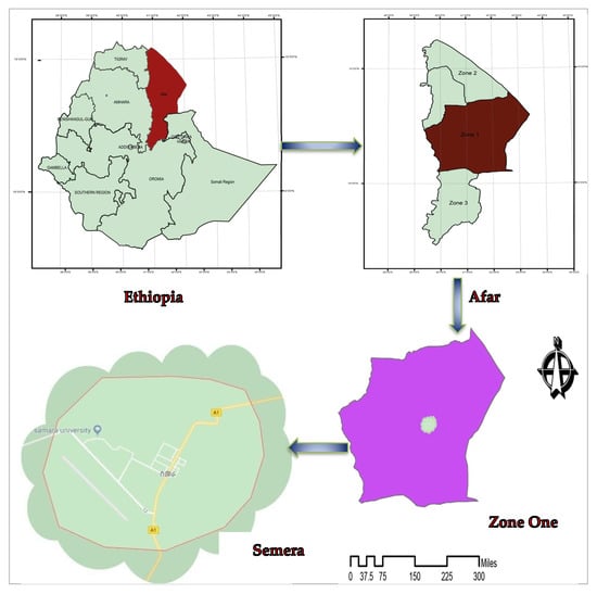 Semera is a new city on the Awash-Asseb highway in the northeast of Ethiopia, and is planned to replace Asaita as the capital city of the Afar region located in the administrative zone 1. Semera has a latitude of 11°47′32″ N and longitude of 41°0′31″ E [47] and is situated at a distance of 595 km from Addis Ababa (Figure 2). The altitude of the city is 433.5 m above sea level.