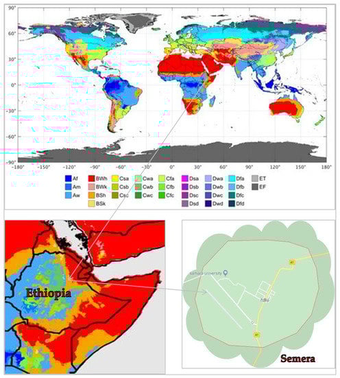 Today, the modified Köppen climate classification is the most generally used system for classifying different climates in the world. It recognizes six main climatic types including tropical moist climates, dry climates, moist mid-latitude climates with mild winters, moist mid-latitude climates with cold winters, and polar climates [48]. According to the Köppen climatic classification subtype, Semera city is under “Bsh” hot semi-arid climate category (Figure 3). The temperature in the city ranges from an average daily maximum of 36.7 °C to a daily minimum of 18.3 °C. In the months of June, July, and August the temperatures reach up to 40 °C. The mean humidity is highest in November (74%) and lowest in July (28%). Semera receives an average of 210.8 mm of precipitation per year. With 55.9 mm of precipitation on average, August is the month with the most precipitation and December is the month with the least precipitation with an average of 2.5 mm.