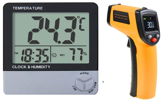 Air temperature and relative humidity are important factors in determining comfort levels in hot-arid climatic regions [54]. Hence, since Semera city is categorized as a hot-arid climate region, the objective measurement was restricted only to air temperature and relative humidity to evaluate the indoor thermal comfort. In this study, the data of indoor and outdoor temperature and humidity were collected using two digital thermometers. The temperature and humidity data were recorded in both the traditional house as well as in the standard condominium house in the absence of any kind of mechanical cooling and ventilation system. The data were recorded for three consecutive months with gaps of three days, resulting in eight measurements per month. The data were manually recorded five times in a day with intervals of three hours starting from 7:00 a.m. to 6:00 p.m. Among all the seasons in the study area, Bega (winter) and Belg (autumn) are those that causes major discomfort due to the presence of high relative humidity at elevated temperatures. Hence, it is important to assess the indoor thermal comfort in these two seasons. The months of February, March, and April were considered in this study. The month of February will represent Bega (winter) and the months of March and April will represent Belg (autumn) seasons in the study area. The air temperature and relative humidity measurements were carried out on the third floor at a northwest orientation. Since the recorded data for both houses was required over three consecutive months the selection of the room was dependent on the willingness of the homeowners for both types of houses. However, data loggers were placed in the room at a position in which sunlight and heating and cooling devices did not affect them. Figure 4 shows the sensors and data loggers used for the purpose of this study.
